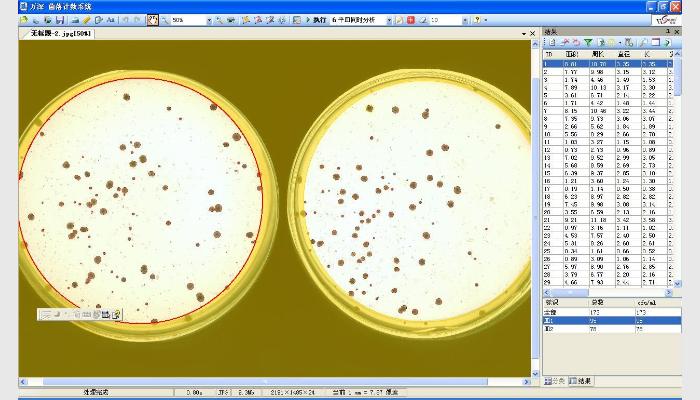 6、★自動分割相互成片粘連的長形、圓形等菌落目標(biāo),用戶可選擇分割或不分割。還可手動分割、合并菌落目標(biāo)圖像。鼠標(biāo)點擊修正,無痕剔除網(wǎng)格及文字,自動剔除雜質(zhì),有效支持復(fù)雜微生物統(tǒng)計,符合GB4789.2-2016的參數(shù)自動換算特性。