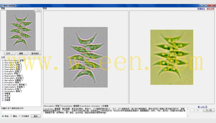 7)★按形狀特征搜索、模糊關(guān)鍵詞搜索、常見藻及浮游動物搜索、分類學(xué)搜索,快速獲取與顯微觀察中未知藻形態(tài)相似的所有藻類、浮游動物,經(jīng)圖像、文字對比,快速鑒定其分類學(xué)歸屬。其中的一級形態(tài)搜索有:單細(xì)胞、多細(xì)胞群體、管狀體、絲狀體、鏈狀體、膜狀體、網(wǎng)狀體;二級形態(tài)搜索有:群體形態(tài)(不定型群體、球形/橢球形、平板片狀、放射狀/帶狀、盤狀/星狀、柵格/扇狀、桃形/心形/多角形、囊狀)、子細(xì)胞排列(有規(guī)律、無規(guī)律)、子細(xì)胞形態(tài)(球形、長形、其它形狀)等。其還包含了對常見有毒藻、水華藻等的搜索特性。